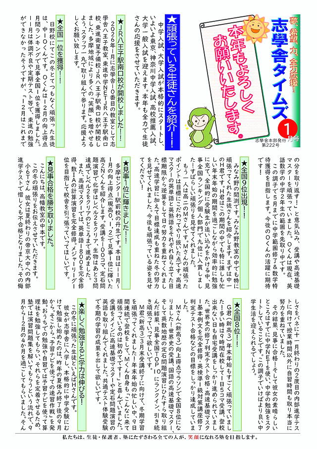 2026.01.21 お知らせ 志學舎タイムズ1月号 2026年1月号の志學舎タイムズをお届けします。いよいよ受験シーズン突入!今回も各校舎で頑張っている生徒を大紹介します。天井を設けない学習指導の成果をぜひご覧ください。 ↓クリックでPDFを表示します。 [志學舎・東進]新教室開校!<八王子教室> [東進]新年度特別招待講習!1/18スタート!! 志學舎ではSNSで情報発信中!ブックマーク登録、チャンネル登録をお願いします! [公式]志學舎チャンネル [公式]志學舎東進チャンネル 前ページ 一覧へ戻る Category お知らせ 速報 中学受験 高校受験 東進中学NET 高校部(東進) キャプテンクラブ プログラミング コラム 志學舎のあゆみ50年 水本代表ブログ(志學舎を語る) 教育誌から 後輩たちへの便り 保育士への挑戦 ブログ 高幡教室 日野教室 豊田教室 立川南口校 南大沢教室 みなみ野教室 西八王子教室 若葉台教室 多摩センター教室 志學舎&東進タイムズ 定期試験対策 春期講習 冬期講習 2024夏期集中講座 Archive 2026 2025 2024 2023 2022 2021 2020 2019 2018