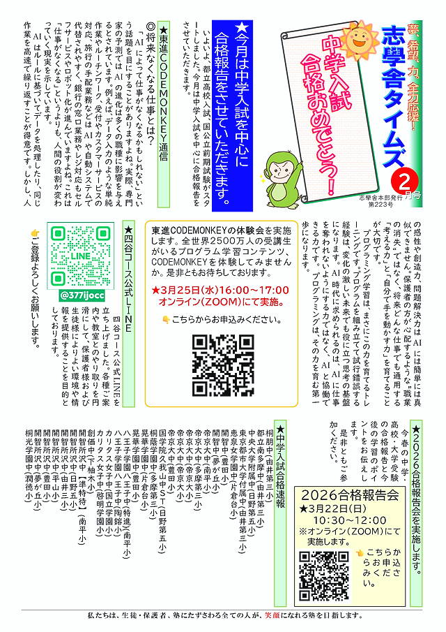 2026.02.21 お知らせ 志學舎タイムズ2月号 2026年2月号の志學舎タイムズをお届けします。中学入試の結果をお知らせします。 ↓クリックでPDFを表示します。 [志學舎・東進]新教室開校!<八王子教室> [東進]新年度特別招待講習!1/18スタート!! 志學舎ではSNSで情報発信中!ブックマーク登録、チャンネル登録をお願いします! [公式]志學舎チャンネル [公式]志學舎東進チャンネル 前ページ 一覧へ戻る Category お知らせ 速報 中学受験 高校受験 東進中学NET 高校部(東進) キャプテンクラブ プログラミング コラム 志學舎のあゆみ50年 水本代表ブログ(志學舎を語る) 教育誌から 後輩たちへの便り 保育士への挑戦 ブログ 高幡教室 日野教室 豊田教室 立川南口校 南大沢教室 みなみ野教室 西八王子教室 若葉台教室 多摩センター教室 志學舎&東進タイムズ 定期試験対策 春期講習 冬期講習 2024夏期集中講座 Archive 2026 2025 2024 2023 2022 2021 2020 2019 2018